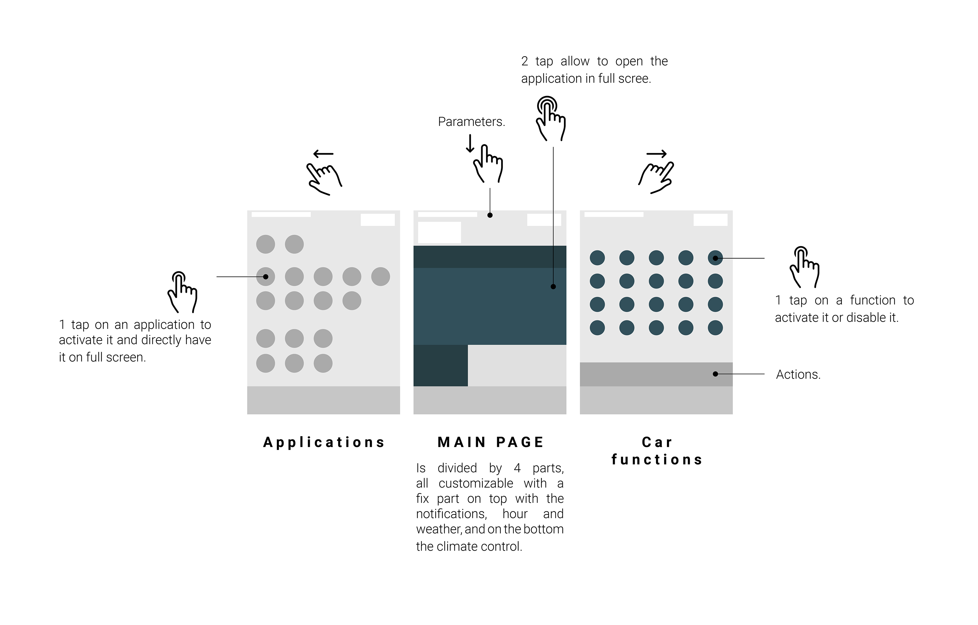 main functions, the connected phone, the navigation, the music player. At the bottom, we have